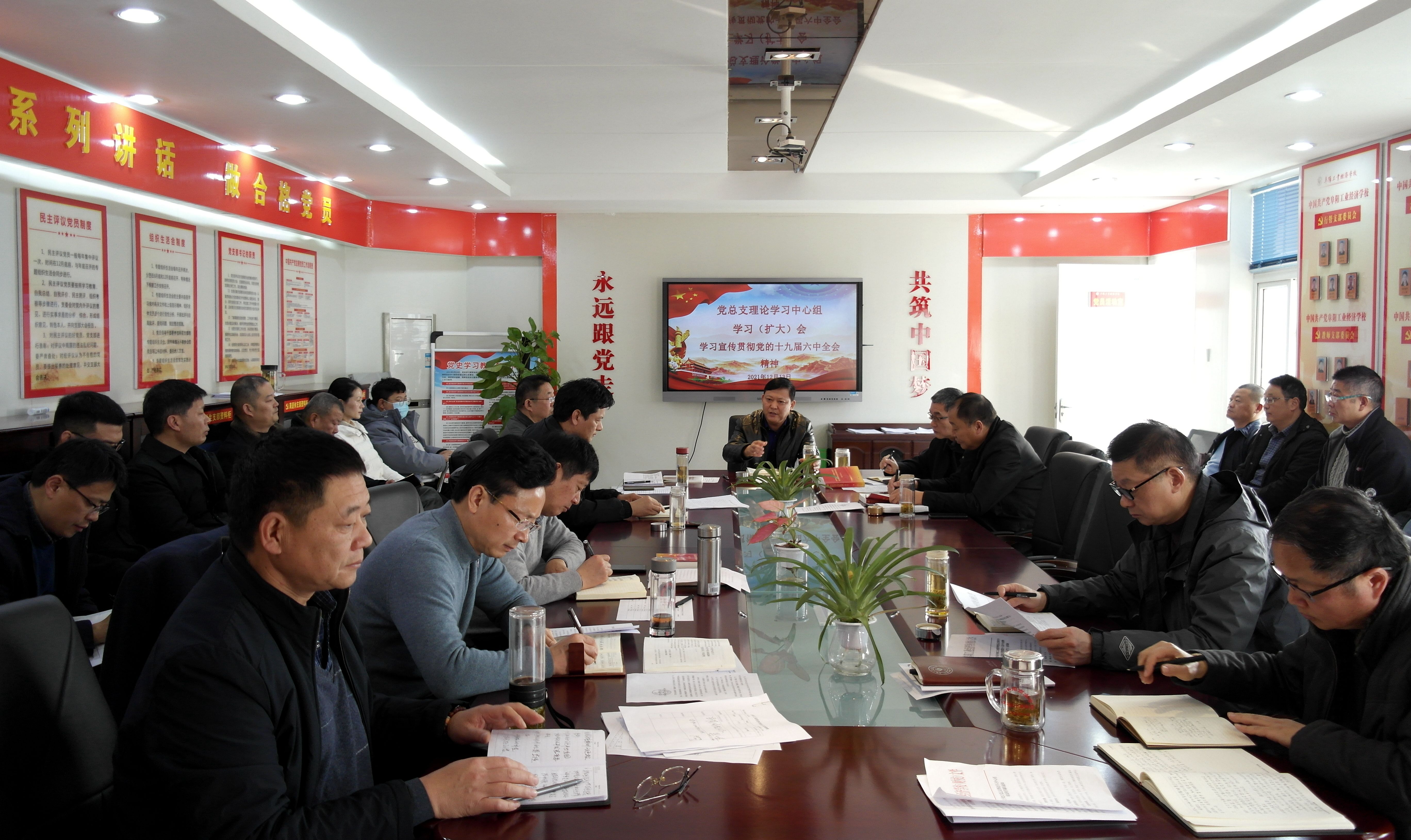 12月13日,阜阳工业经济学校召开党总支理论学习中心组学习宣传贯彻党的十九届六中全会精神(扩大)会。校班子成员、各科室负责人参加会议。会议由校党委书记、校长周波主持。