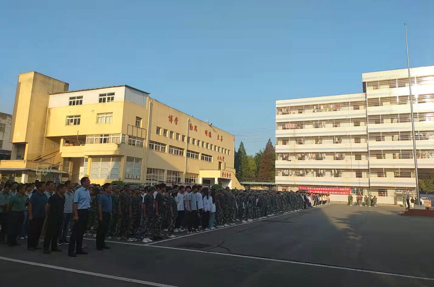 为庆祝中华人民共和国成立72周年,大力营造爱党爱国爱社会的浓厚氛围,弘扬伟大建党精神,砥砺爱国情怀,激励全校师生以更加昂扬的士气、更加饱满的精神,开启新学年、奋斗新征程。9月30日上午,在阜阳工业经济学校南校区和东校区隆重举行“请党放心、强国有我”主题升旗仪式。全体师生4000余人参加升旗仪式。