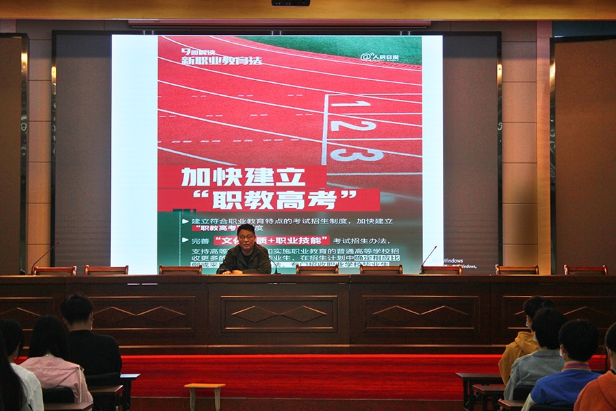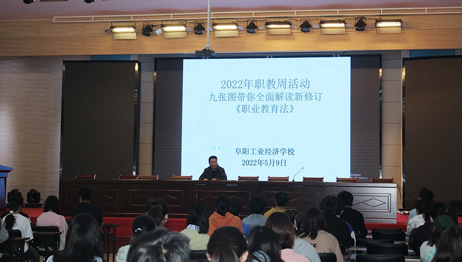日在学校大礼堂教务科李阜生科长给在校部分学生代表解读新修订的《职业教育法》。
