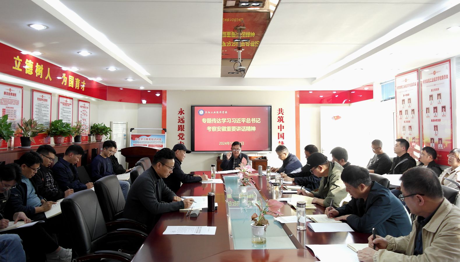 10月24日,阜阳工业经济学校召开党委扩大会议,专题传达学习习近平总书记考察安徽重要讲话精神和省委常委会、全省领导干部大会、市委常委会扩大会、市财政局党组扩大会议精神,部署安排我校学习宣传贯彻工作。校党委书记周波主持会议并讲话。校领导、各支委成员及科室处负责人参加会议。