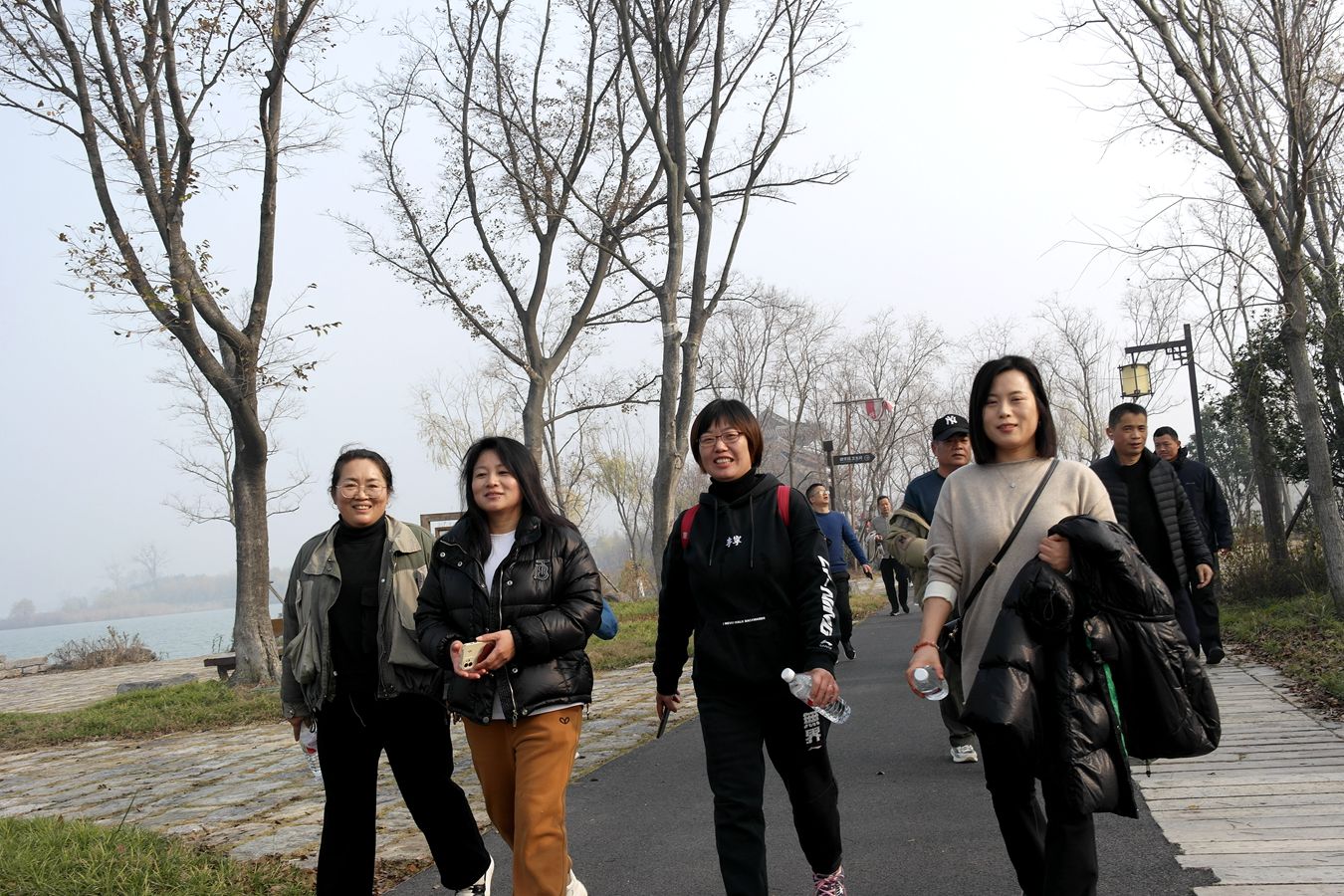 我校健身走队伍中既有即将退休的老教师,也有刚刚参加工作的青年教师,他们时而交流工作,时而沟通友谊,一路上欢歌笑语、气氛和谐,每一个人的脸上都挂着灿烂的笑容,尽情享受着运动带来的快乐。