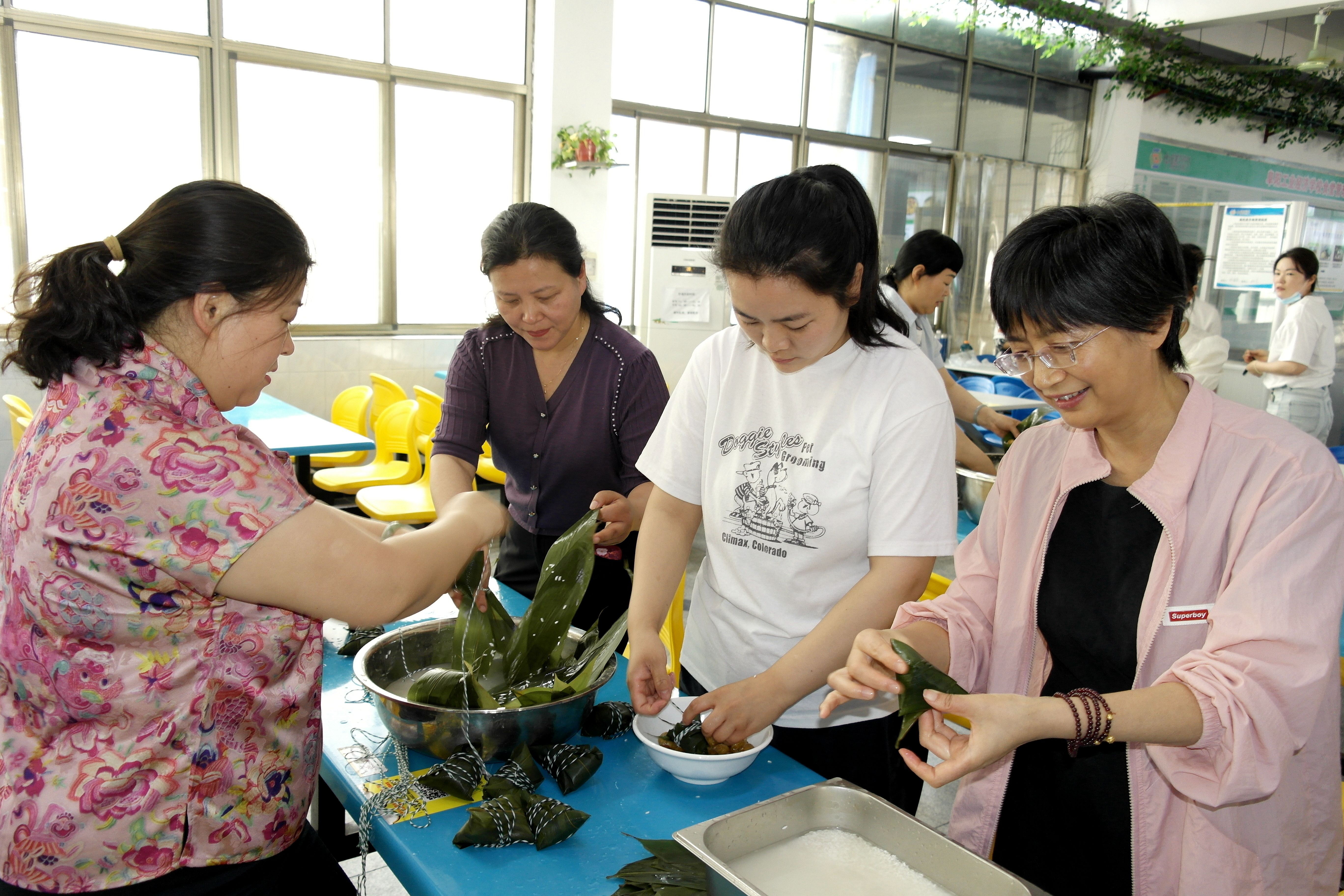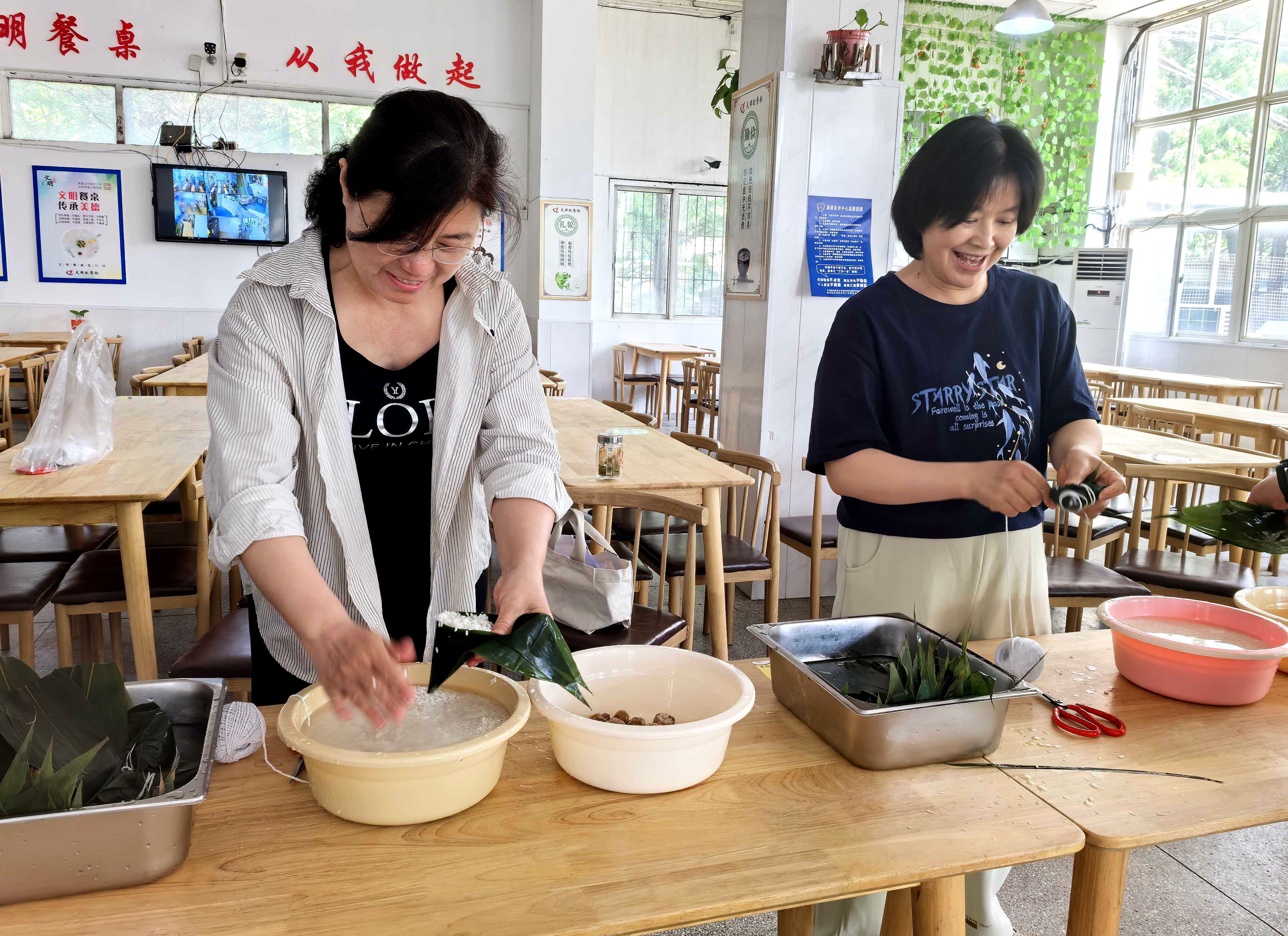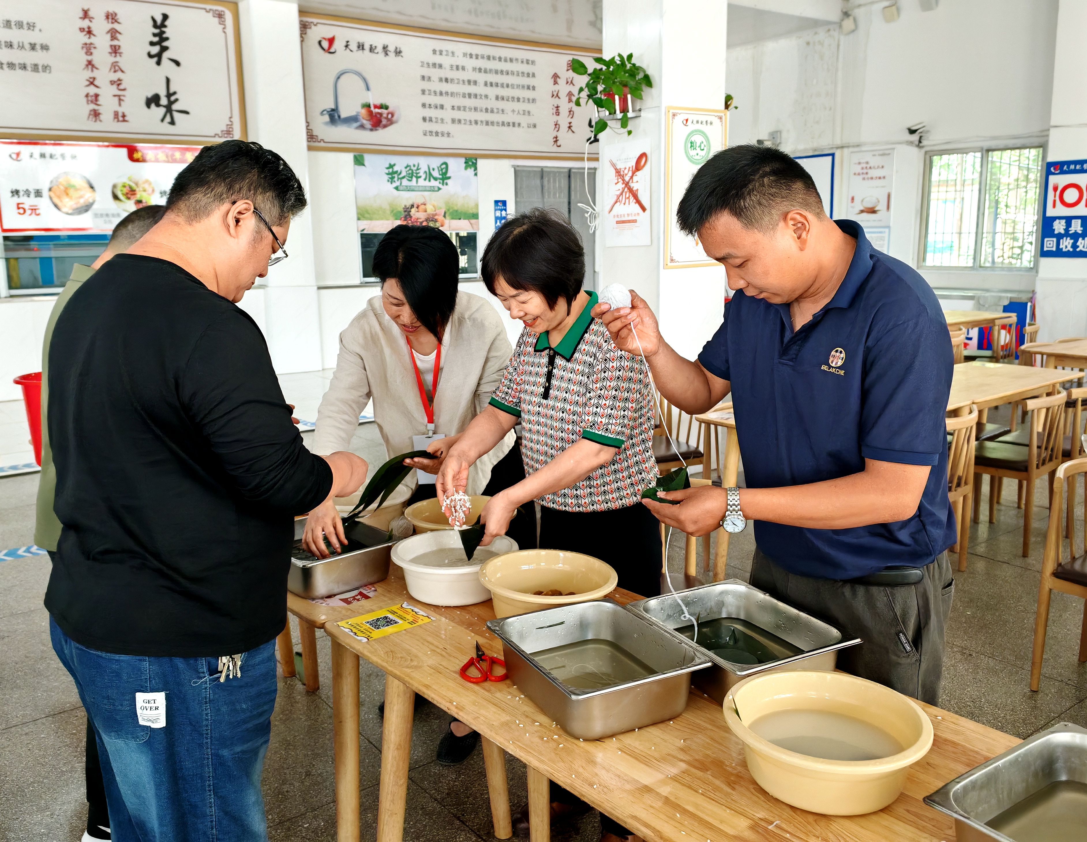 活动伊始,老师们纷纷拿出看家本领,翠绿的粽叶裹着洁白的糯米和蜜枣,一个个棱角分明的粽子在手中成型。过程中,工作人员巧妙地将廉洁文化融入其中,通过讲述古代清官廉吏与端午的故事,让“廉”味在粽叶间悄然传递;食安办人员通过食堂里图文并茂的展板和生动的讲解,向老师们倡导珍惜粮食、反对浪费的生活理念。