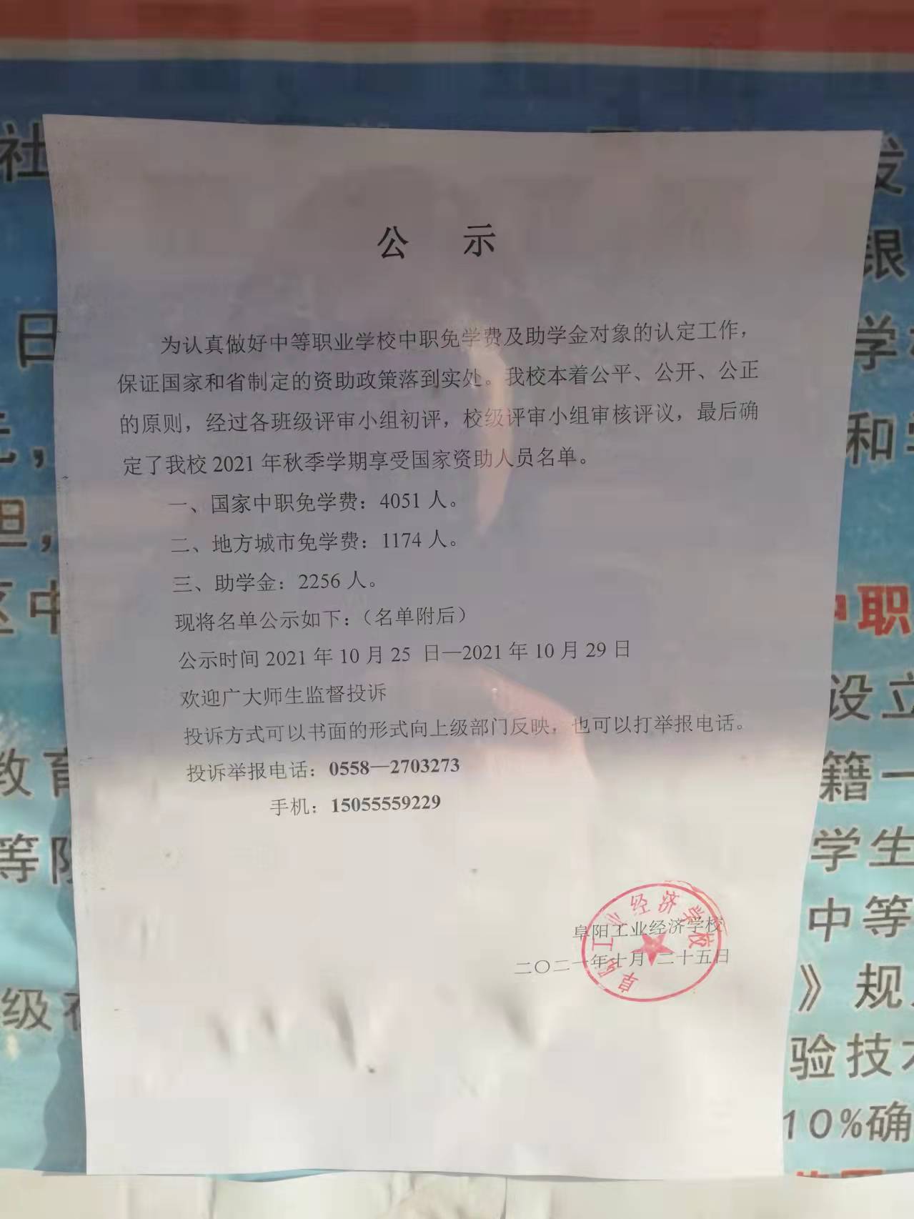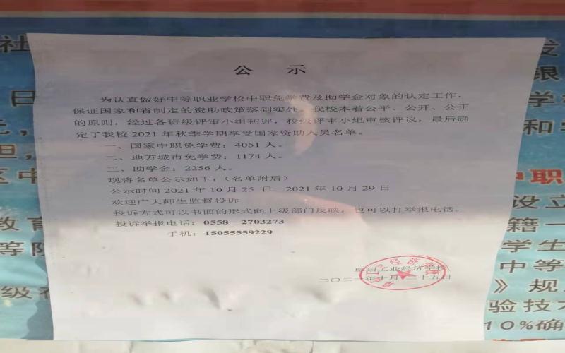 阜阳工业经济学校 2021年秋季学期资助、免学费公示