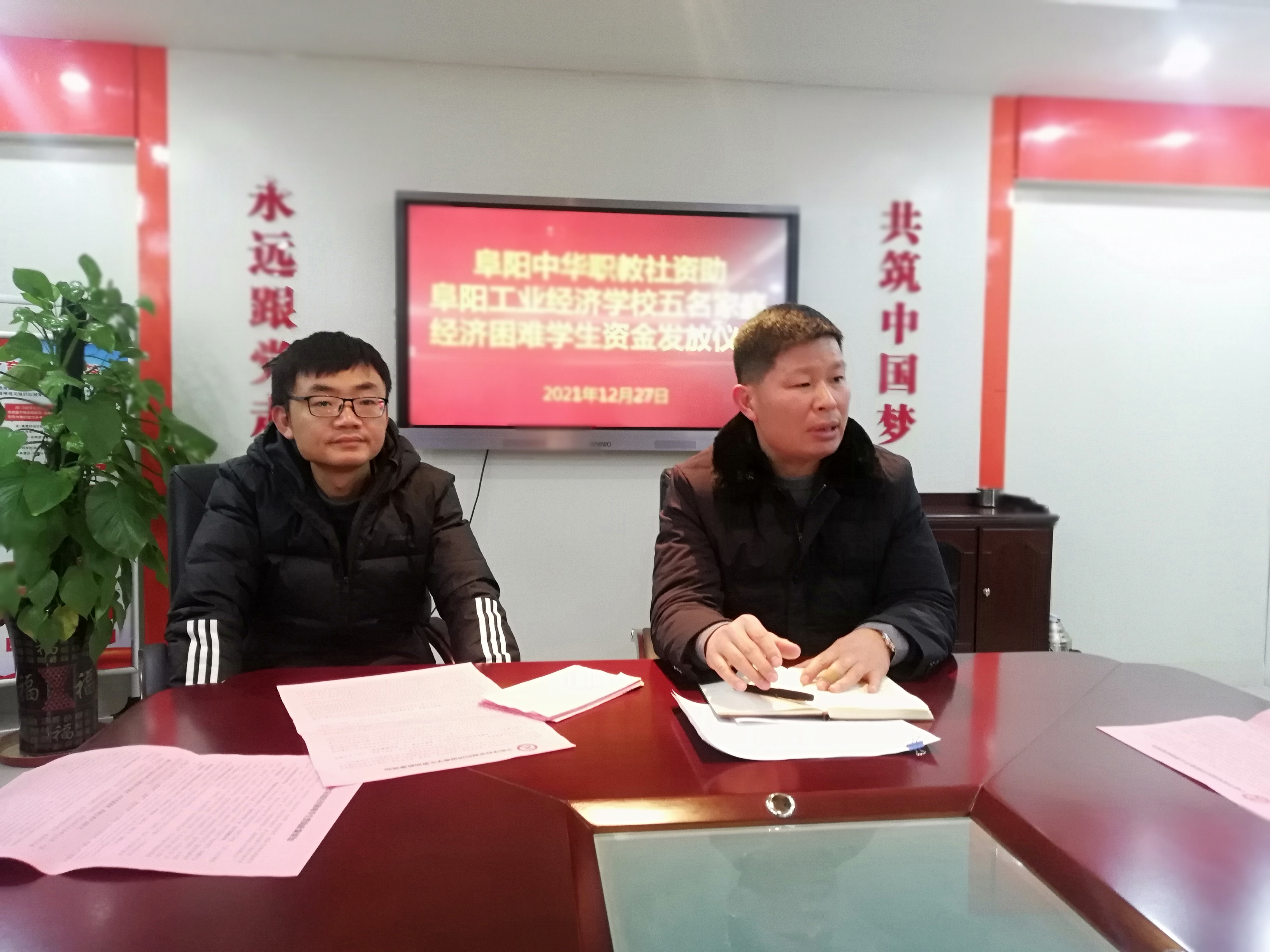 12月27日下午,阜阳工业经济学校在校办公楼四楼会议室举行“阜阳中华职教社资助阜阳工业经济学校五名贫困家庭学生资助金发放仪式”。资助办主任姜亮主持会议并讲话。