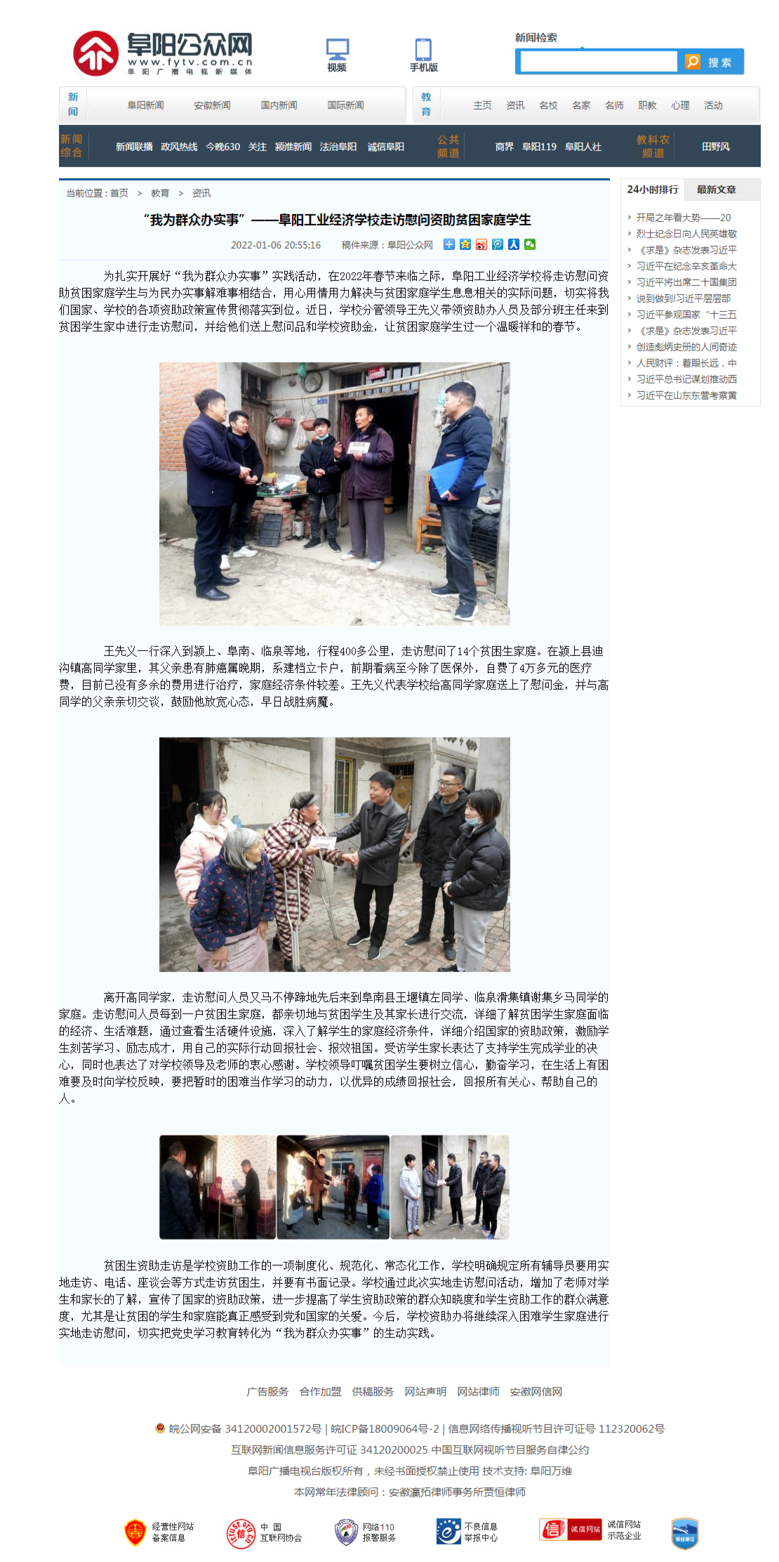 阜阳公众网报道“阜阳工业经济学校走访慰问资助贫困家庭学生”