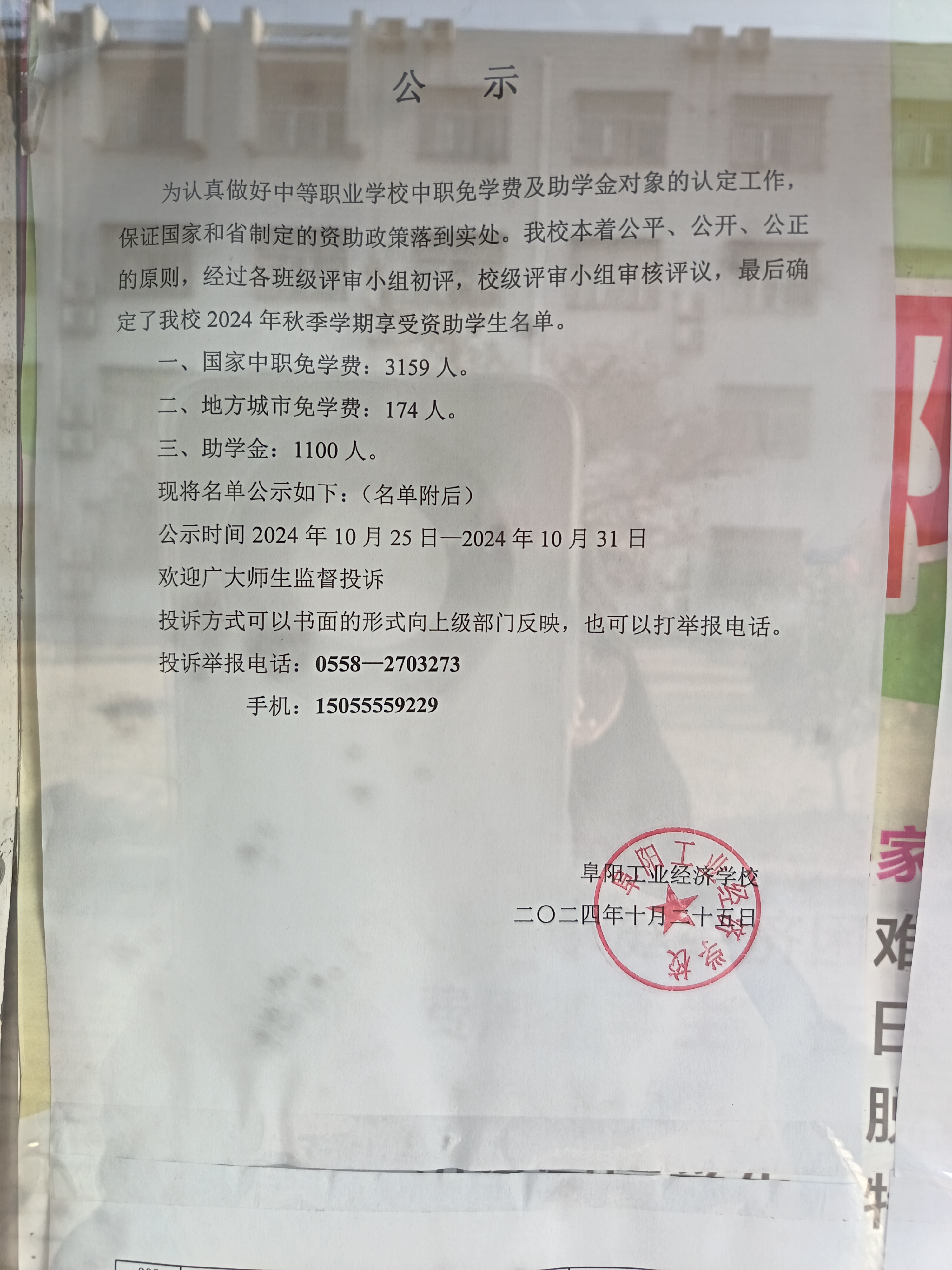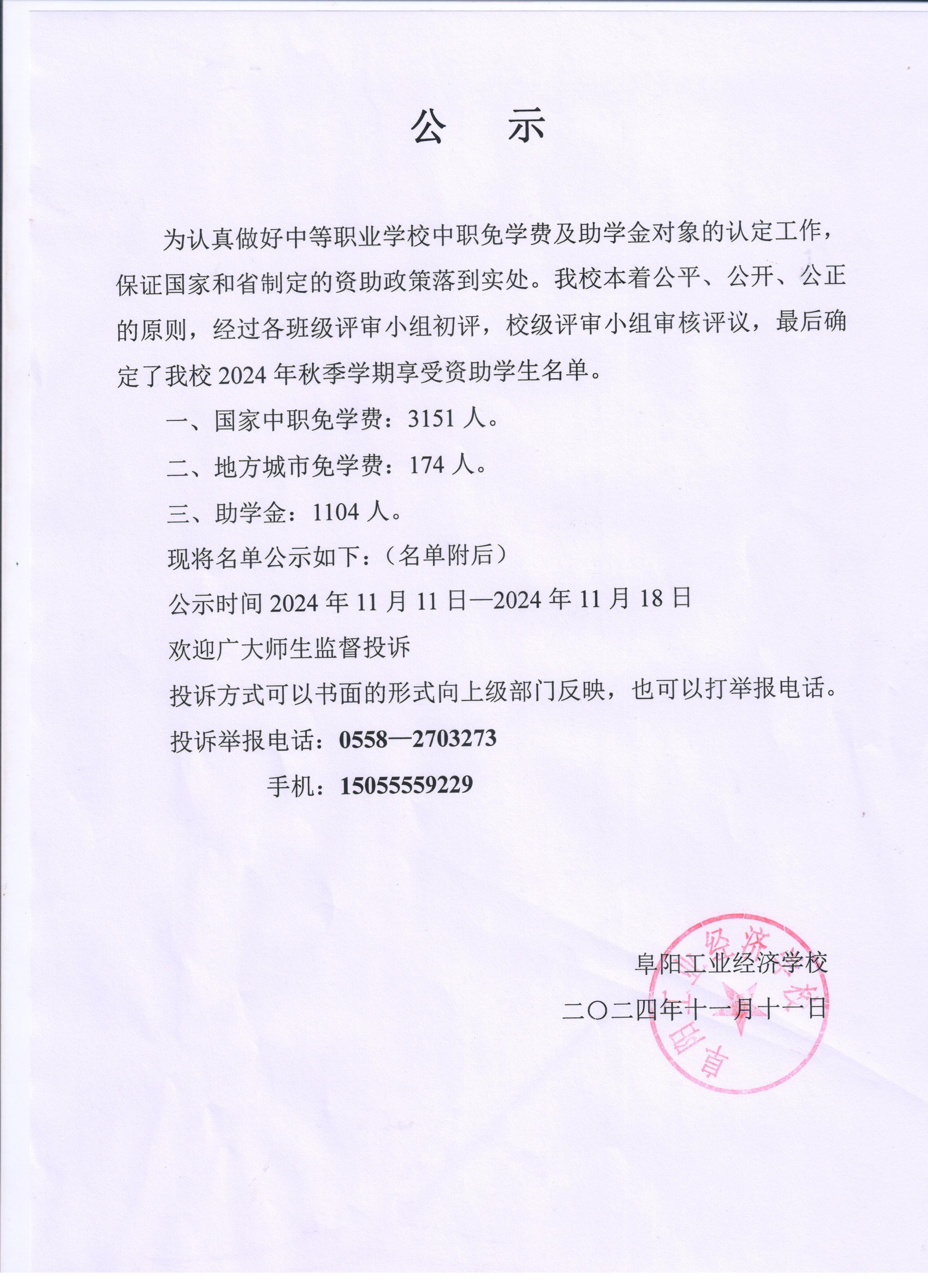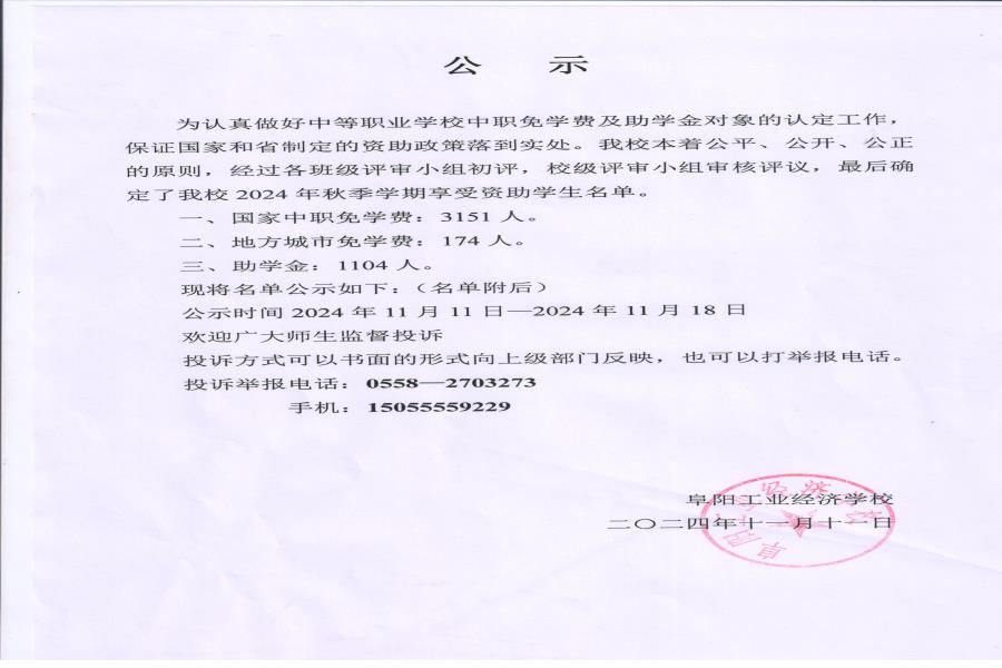 阜阳工业经济学校 2024年秋季学期资助、免学费公示